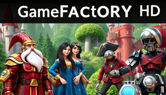 and gold armor, a wizard with a long white beard, a princess with long dark hair wearing a blue dress, a pirate with a white shirt and a black hat, and a robot with a round silver head and a black body. The background contains a medieval castle, a mystical forest, a princess tower, a pirate ship, and a futuristic city. The text "GameFactory" is placed at the top of the image in white, bold letters. The lighting is bright. The image is rendered in HD.