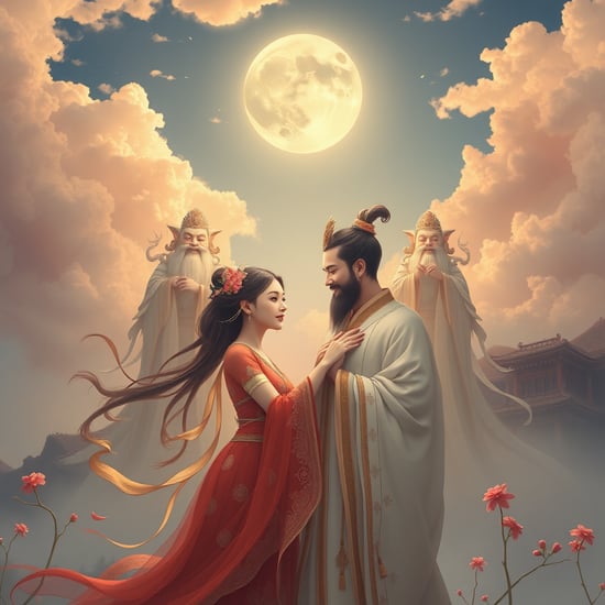 The soul of a woman and a man embrace, and above the sky there are four gentle Chinese gods waiting